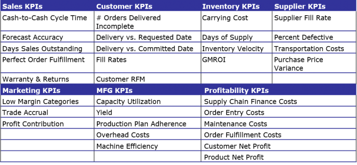 It is important to note that for a KPI to be used effectively throughout the enterprise, there has to be agreement on the definition, with acknowledgement of the different needs for different departments while still supporting top-level business goals. For example, a company that’s focusing on revenue growth and profitability may want to employ metrics that cascade down to the operational level with illustrative dashboards that highlight weekly customer shipments, perfect order fill rates, backlog metrics, and accounts receivable (DSO).